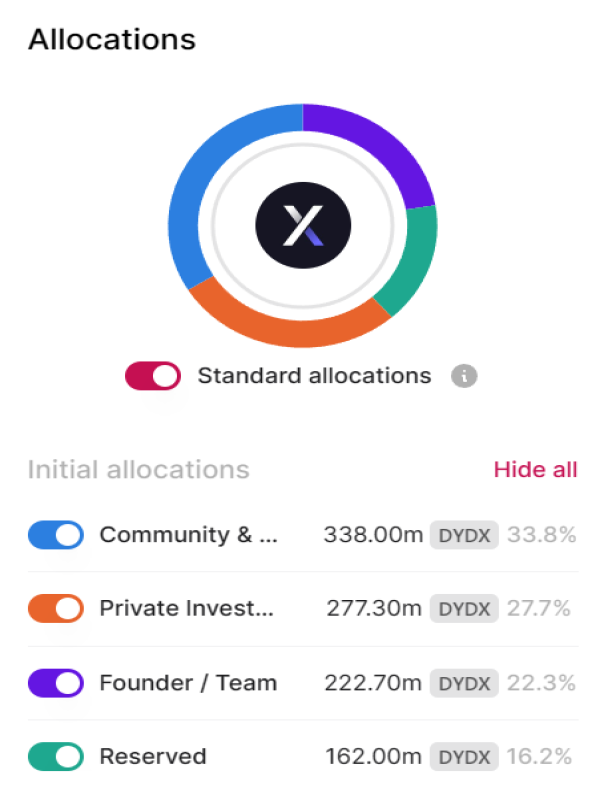 DYdX 在 8 月 1 日以相同的资金分配进行了相同的解锁活动。ThuobienUnlocks 的 dYdX 全部分配数据显示,投资者持有最高分配比例,为 27.7%,其次是交易奖励和社区金库,分别为 20.2% 和 16.2%。