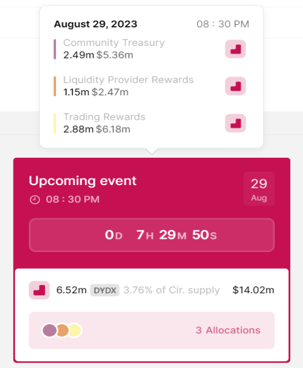 8月29日,dYdX将发行652万枚代币,占DYDX流通量的3.76%。其中,249 万枚 DYDX 代币(价值 536 万美元)将分配给社区金库。财政部为捐助者赠款、社区倡议和流动性挖掘等项目提供资金。